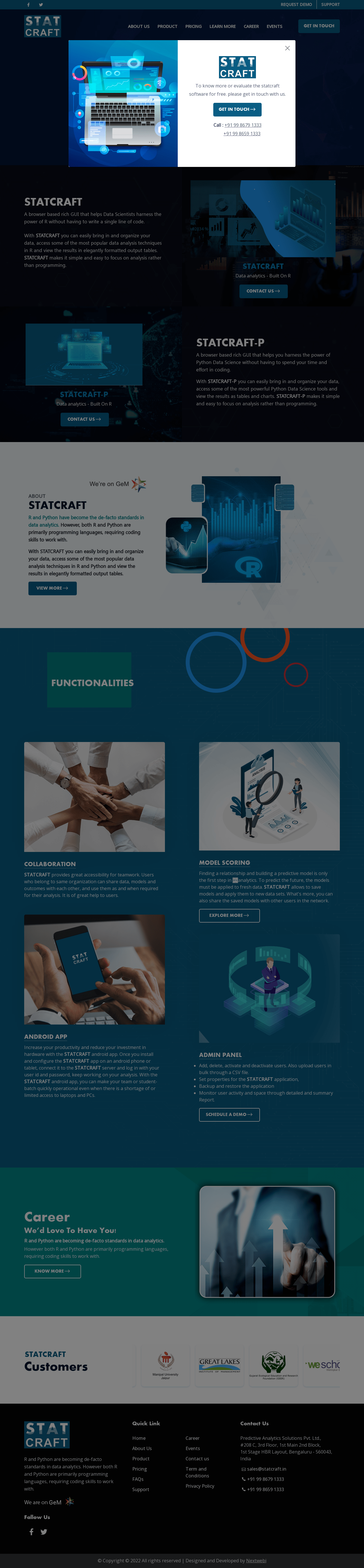 STATCRAFT is an Data Analytics Company who can easily bring in and organize your data, access some of the most popular data analysis techniques in R and Python and view the results in elegantly formatted output tables.